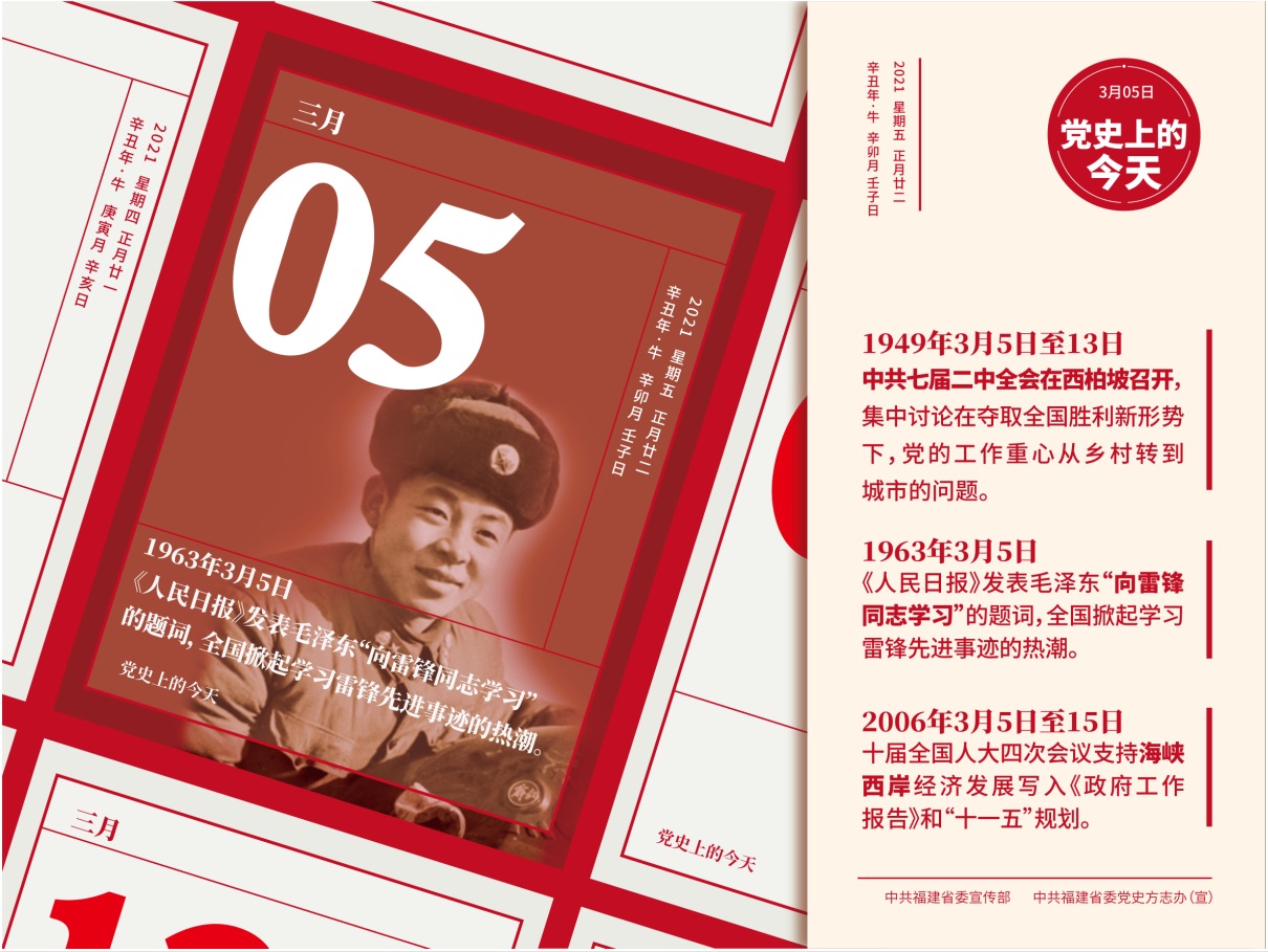 《人民日报》刊登毛泽东“向雷锋同志学习”的题词。这个题词是应《中国青年》杂志社要求,于二月二十日为该刊学习雷锋专辑题写的,三月二日出版。《解放军报》三月六日发表了刘少奇的题词“学习雷锋同志平凡而伟大的共产主义精神”;周恩来的题词“向雷锋同志学习憎爱分明的阶级立场,言行一致的革命精神,公而忘私的共产主义风格,奋不顾身的无产阶级斗志”;朱德的题词“学习雷锋,做毛主席的好战士”;邓小平的题词“谁愿当一个真正的共产主义者,就应该向雷锋同志的品德和风格学习”。陈云七月八日为雷锋题词:“雷锋同志是中国人民的好儿子,大家向他学习。”