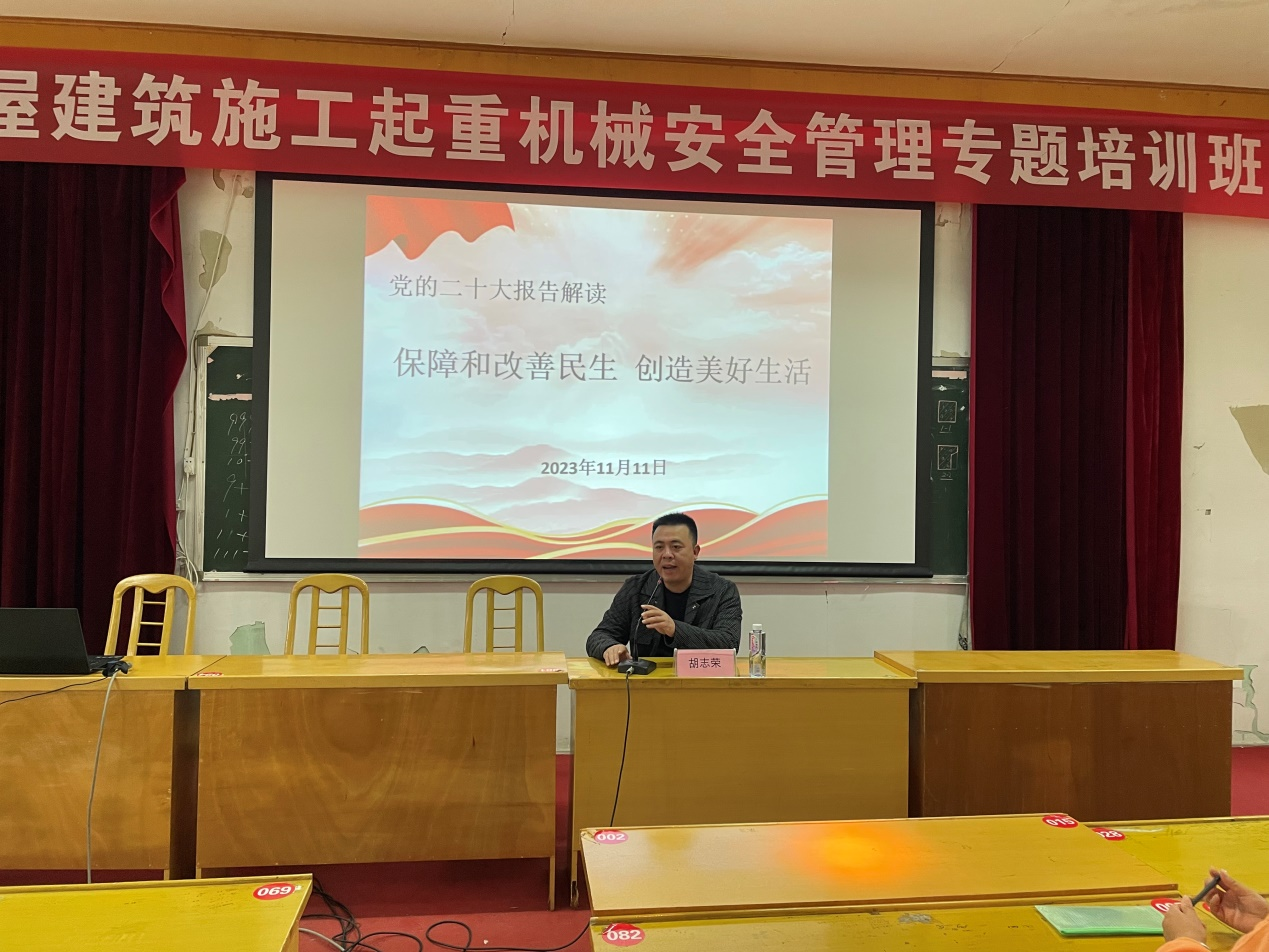 在本次建筑施工起重机械安全管理专题培训班上,学校招生就业办与成人教育科科长胡志荣开展“保障和改善民生 创造美好生活”的专题宣讲,解读了党的二十大报告提出的:必须坚持在发展中保障和改善民生,鼓励共同奋斗创造美好生活,不断实现人民对美好生活的向往。他表示在各项工作中应坚持全心全意为人民服务的根本宗旨,立足各自岗位和领域,埋头苦干、奋勇前进,将宏伟蓝图变成美好现实,为全面建设社会主义现代化国家、全面推进中华民族伟大复兴而团结奋斗。