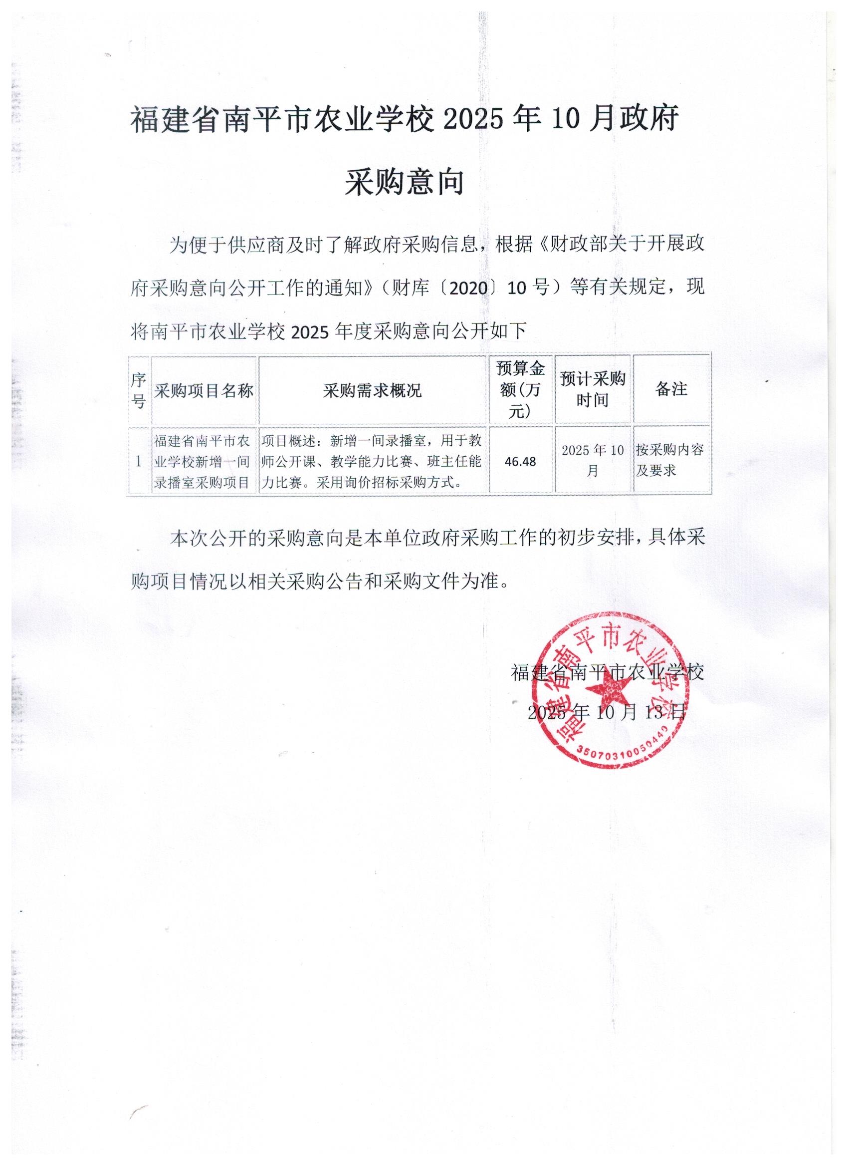 【公开公示】 南平市农业学校新增一间录播室采购项目意向公告
