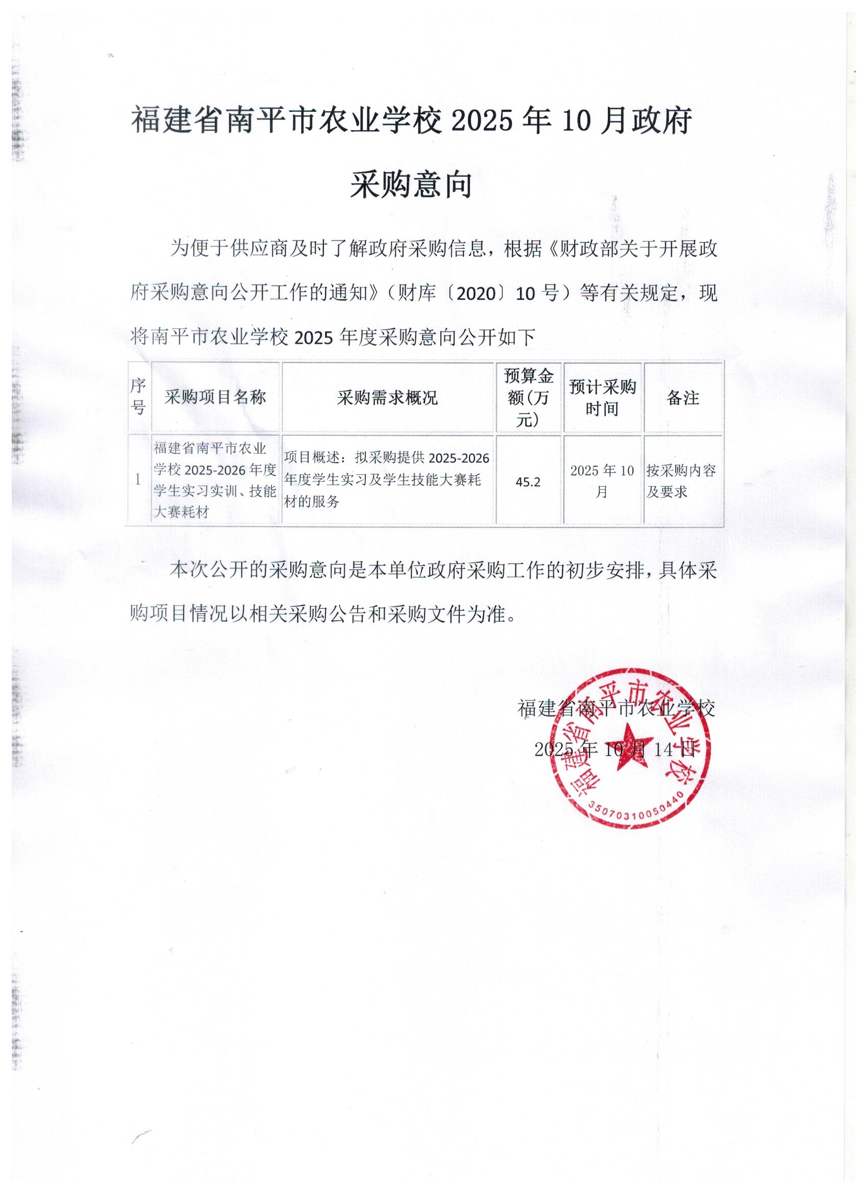 南平市农业学校2025-2026年度学生实习实训、技能大赛耗材采购意向公告