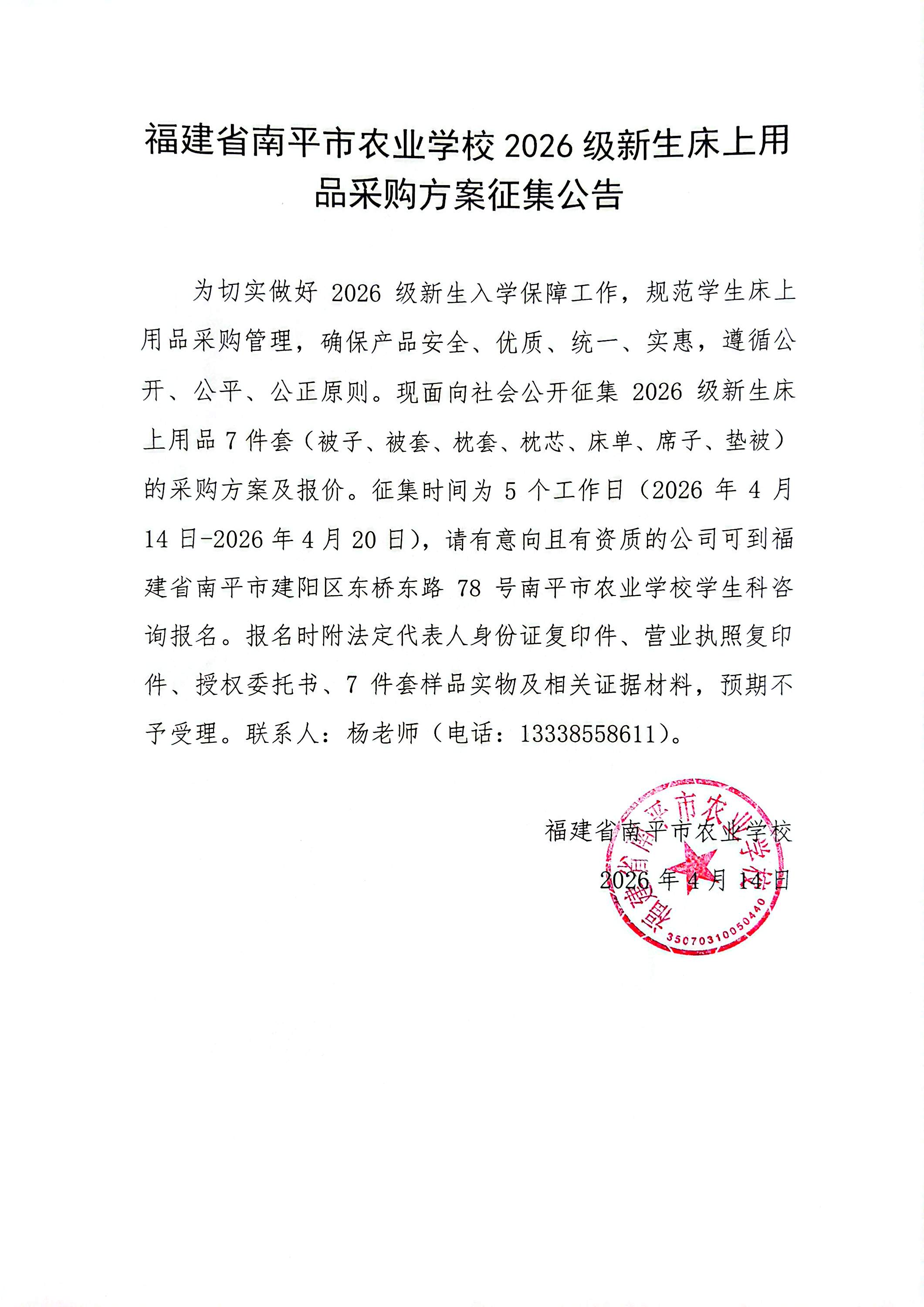 【公开公示】 福建省南平市农业学校2026级新生床上用品采购方案征集公告