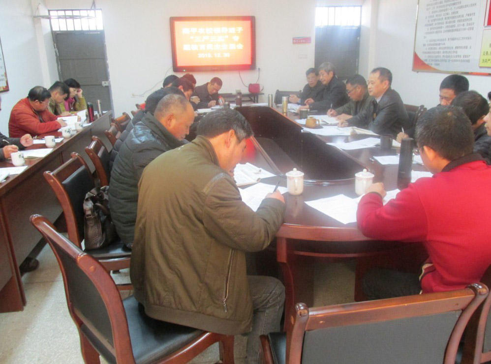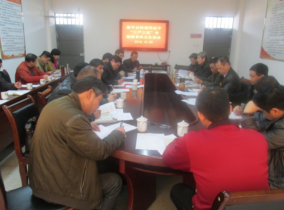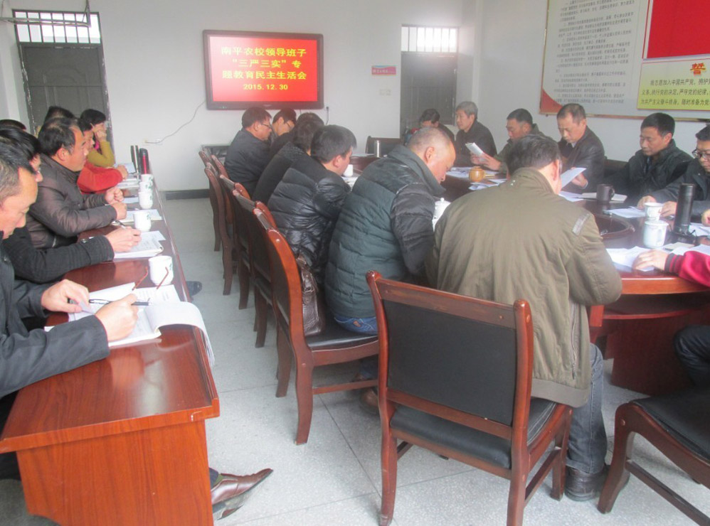 2015年12月30日下午,南平农校党总支按照《中共南平市纪委、中共南平市委组织部关于开好“三严三实”专题民主生活会有关事项的通知》(南委组综【2015】86号)的有关要求,组织召开校领导班子“三严三实”专题民主生活会。会议由校党总支书记田建鸣主持,校党政班子成员、所属各党支部书记及各科室主要负责人参加了会议。